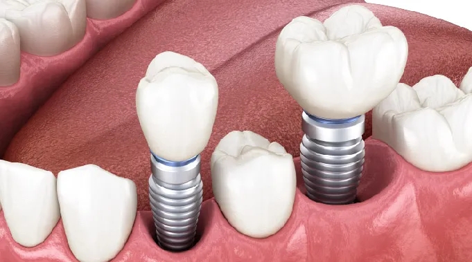 Jenis implan gigi untuk menggantikan beberapa gigi yang hilang pada lokasi yang berbeda.
